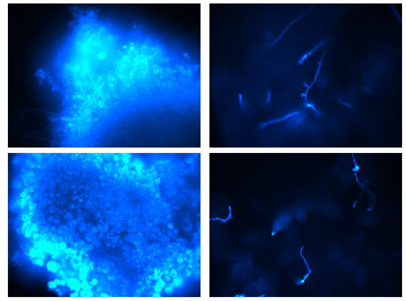 真菌荧光染色液是一种含有荧光素和抑制背景荧光染料的复合染液,用于人体样本中的真菌荧光染色。荧光素能与真菌细胞壁上的β-多糖结合,在荧光显微镜的特定通道下产生荧光;染液内含的氢氧化钾可溶解样本中的角质,有助于更清晰的观察真菌结构,从而实现快速检测样本中的真菌。