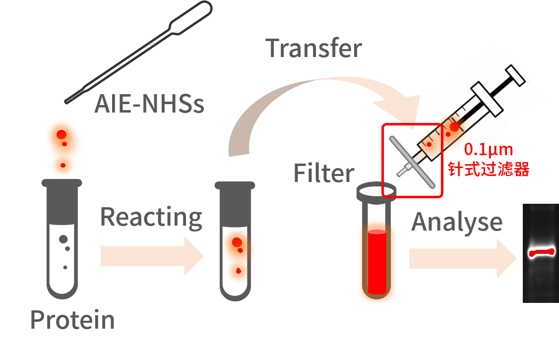 在实验操作层面, AIE试剂因其“聚集诱导发光”(Aggregation-induced Emission,AIE)机制,游离单体几乎无荧光,只需用0.1μm针式过滤器即可滤去多余染料,样本损失少,且无需使用纯化柱,有效节省时间,并降低了耗材成本。